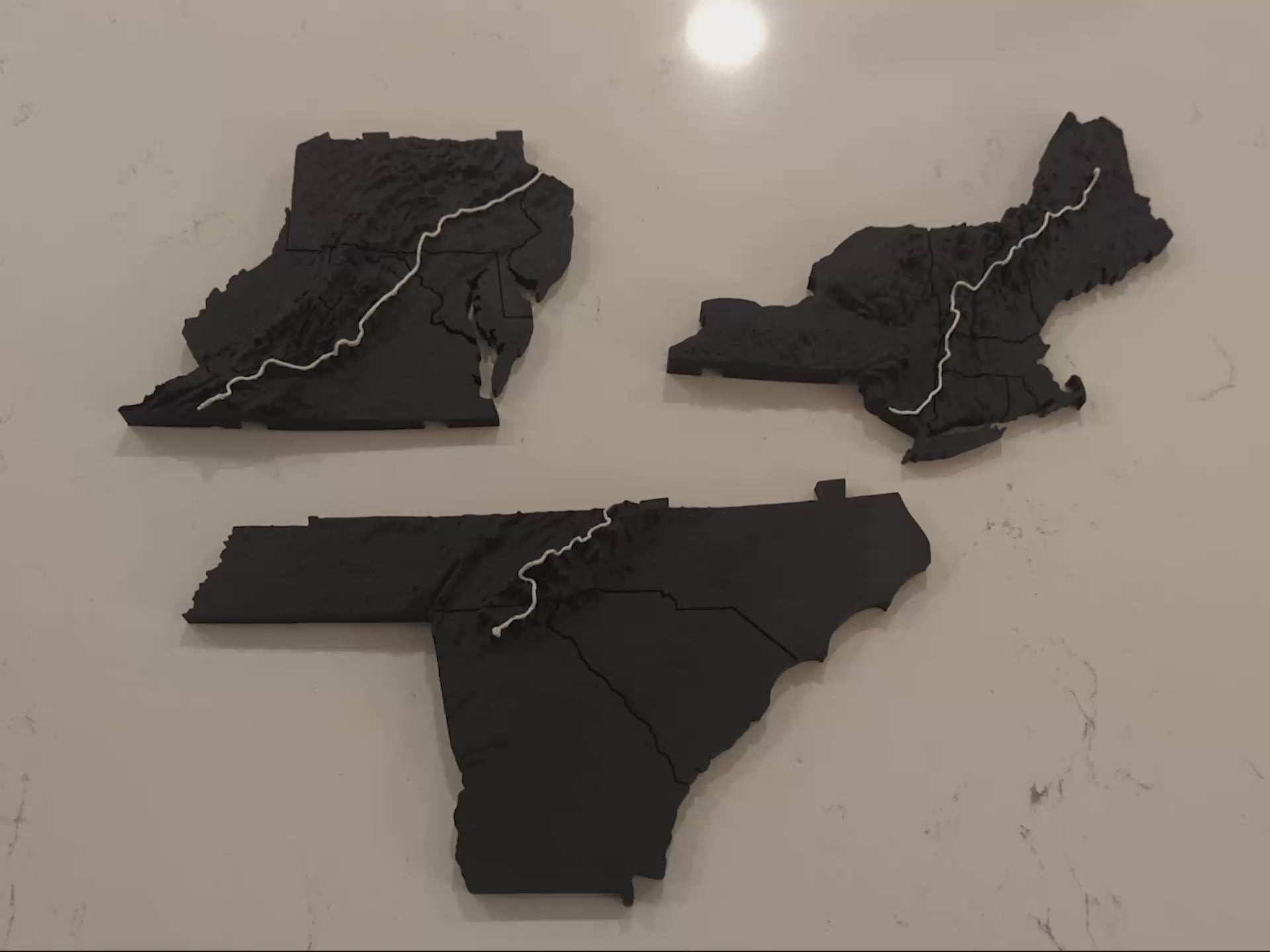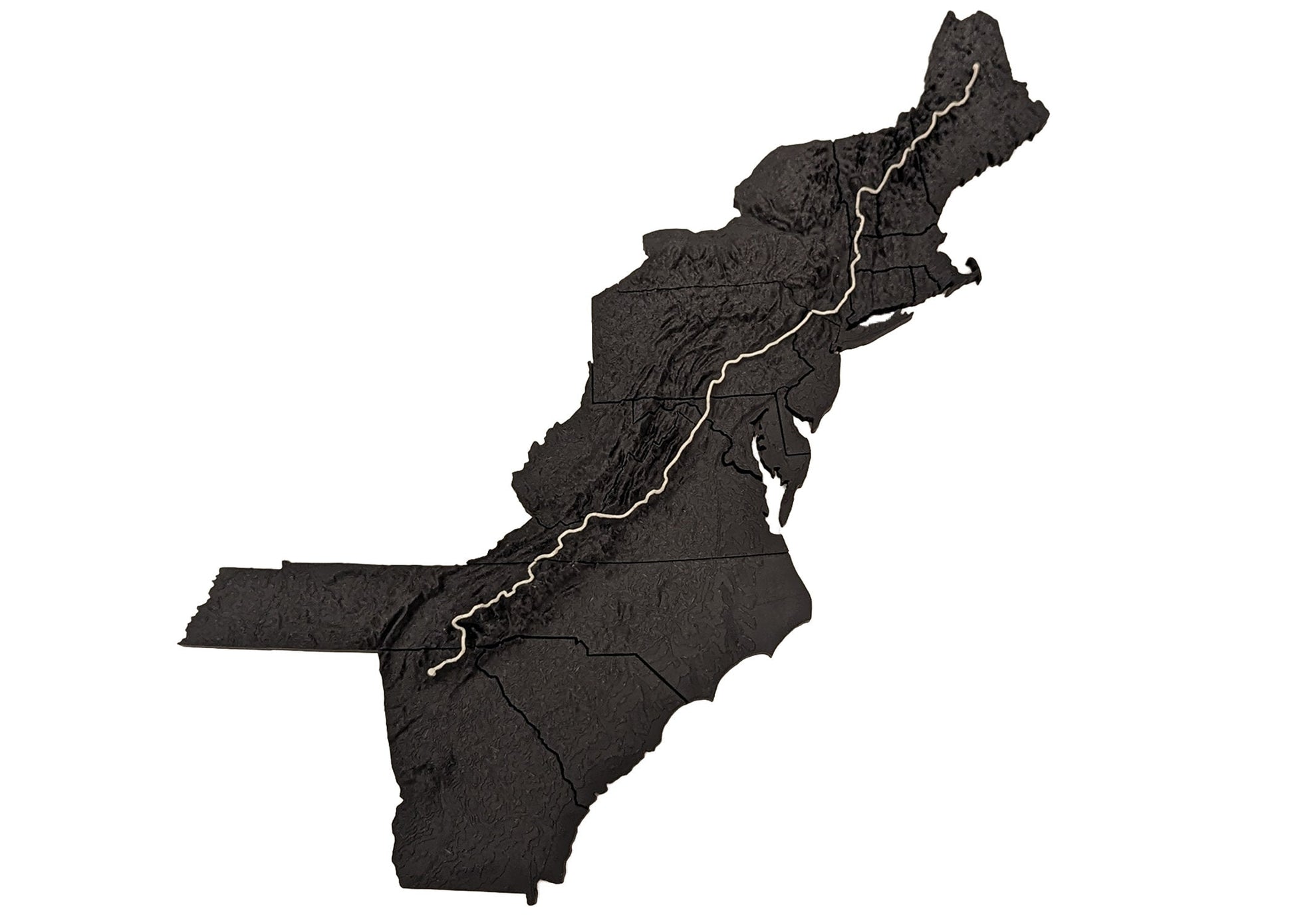 The 2,190 mile Appalachian Trail (AT) overlaid onto extremely detailed topographic maps of the 13 states it passes through (plus South Carolina, Delaware, and Rhode Island to complete the map of this region of the US). The map is separated into three parts and can be easily pressed together with integrated dovetail joints, similar to a puzzle. The map occupies an area of roughly 15.9 x 15.1 in (40 x 39 cm).