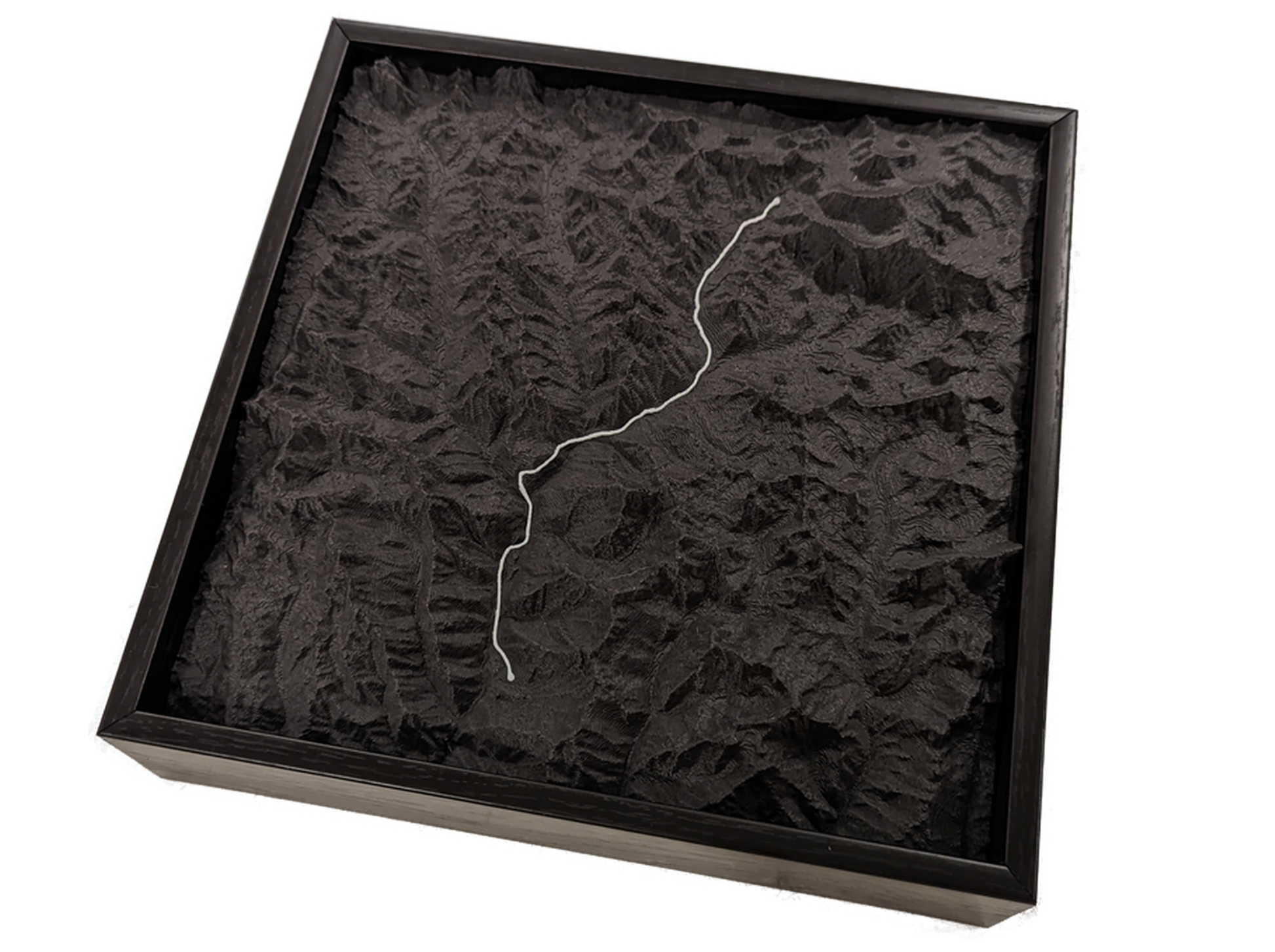Each order includes one custom map. We offer an unframed hexagon version which measures 8.7 x 7.5 inches (22 x 19 cm), and a framed square version which measures 9 x 9 inches (22.8 x 22.8 cm). This map is made using multicolor 3D printing, where the terrain is printed in black and the trail is printed in white.