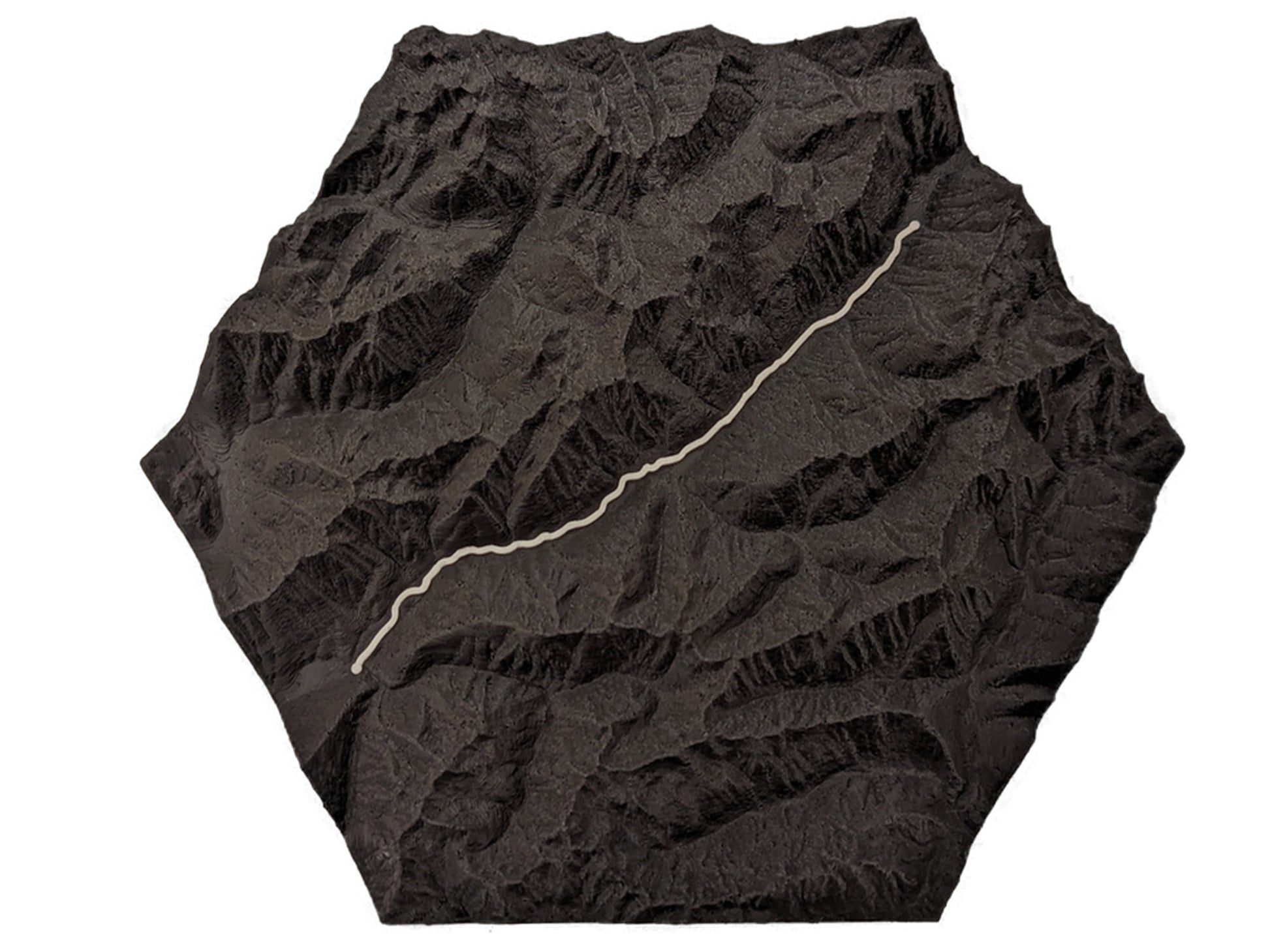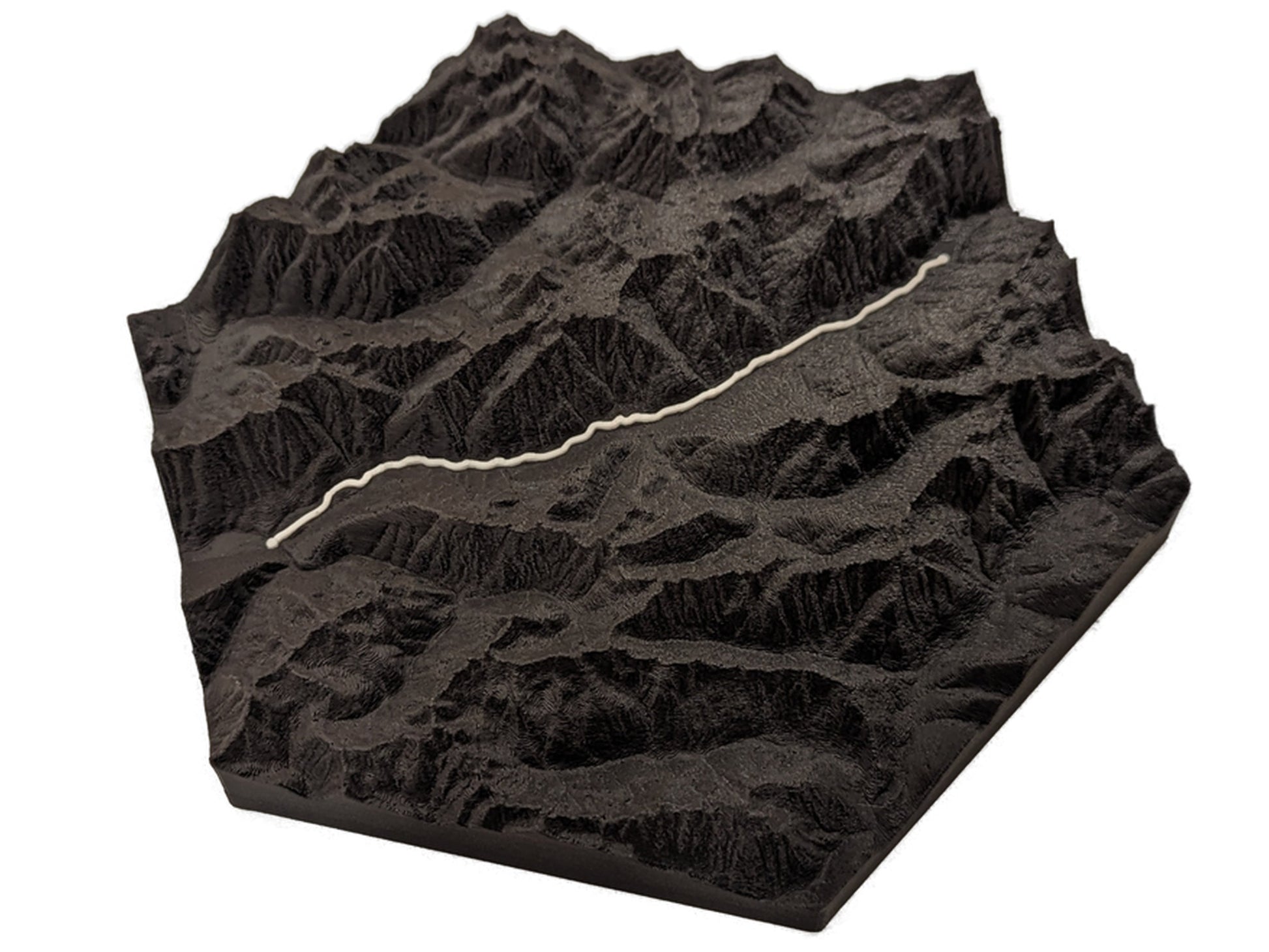 This map is made using multicolor 3D printing, where the terrain is printed in black and the trail is printed in white.