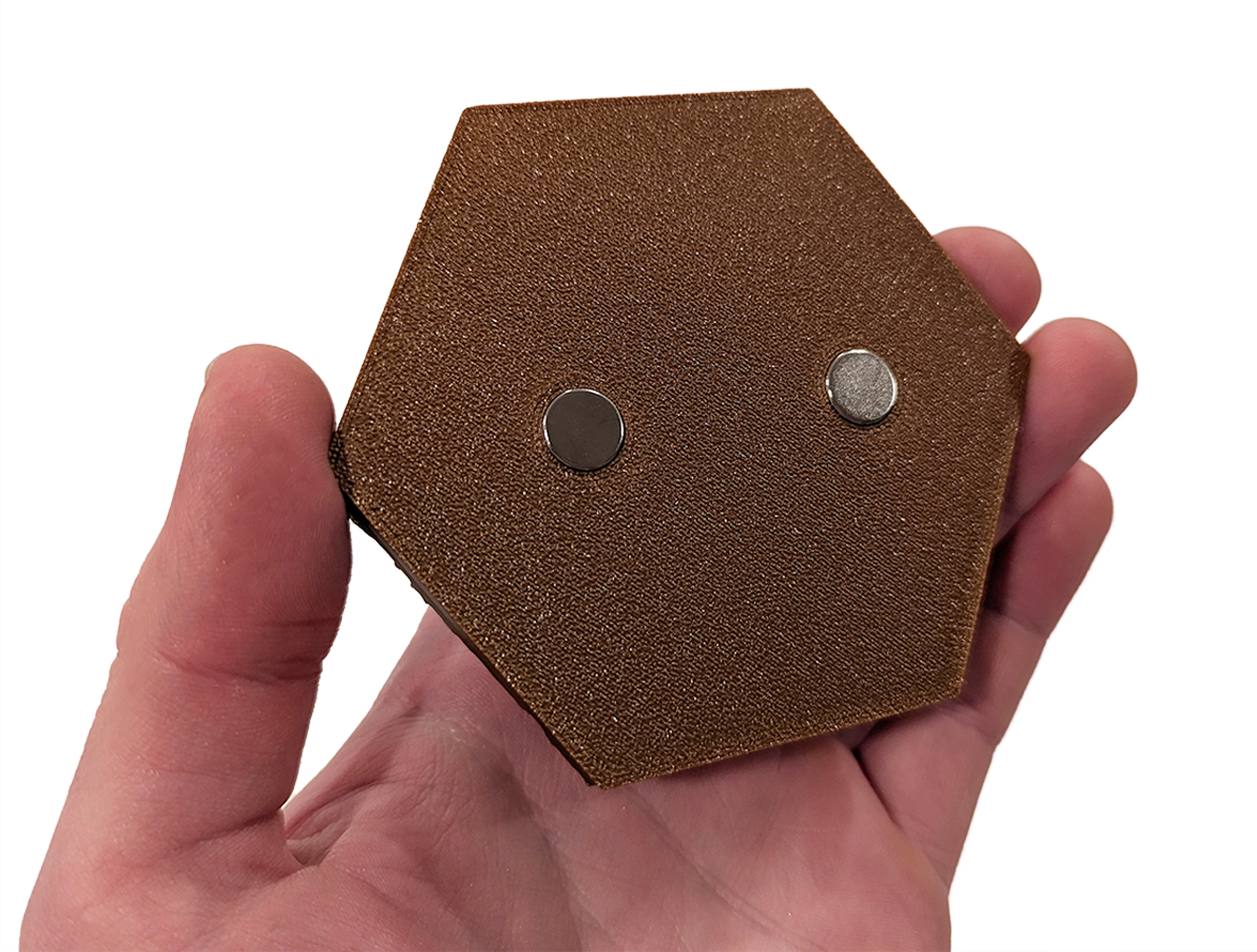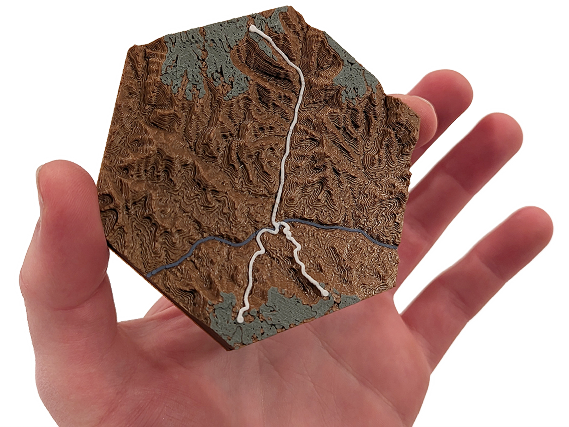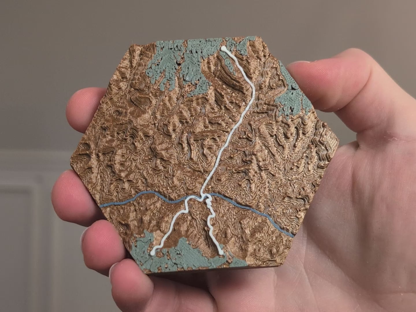 This magnet is made using multicolor 3D printing, where the terrain is a tan/copper color, the Colorado River is blue, foliage is green, and the trail is white.