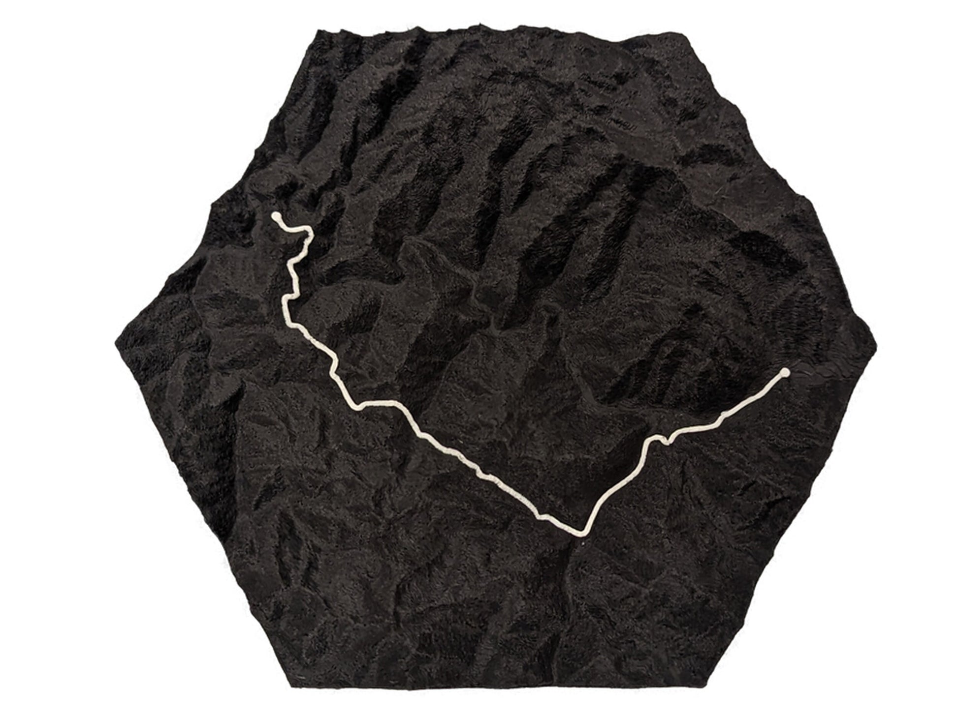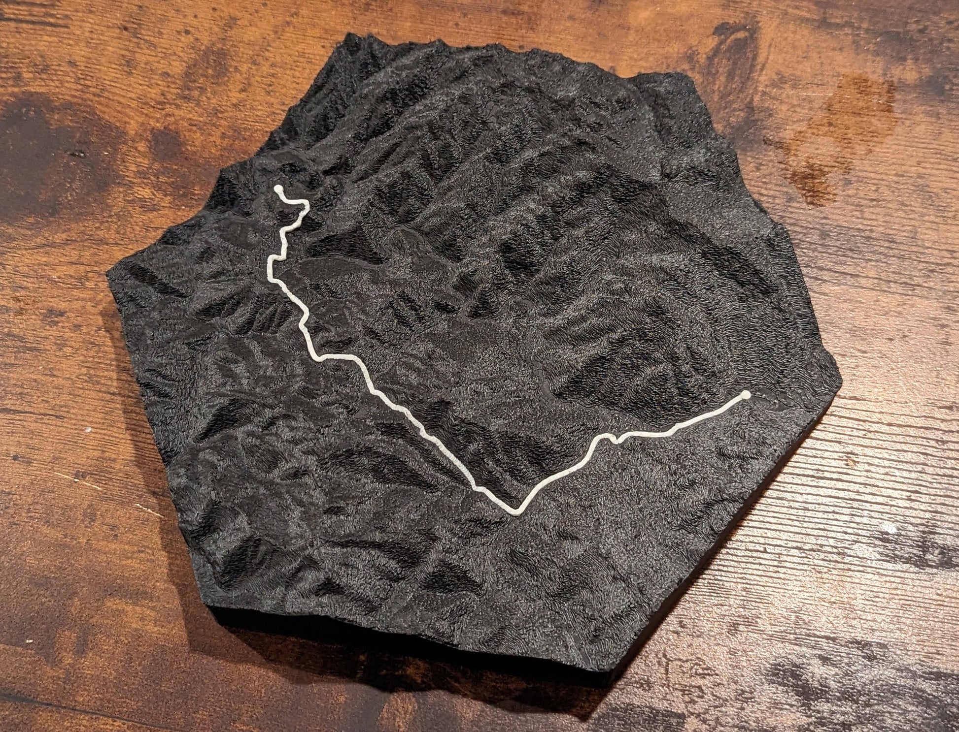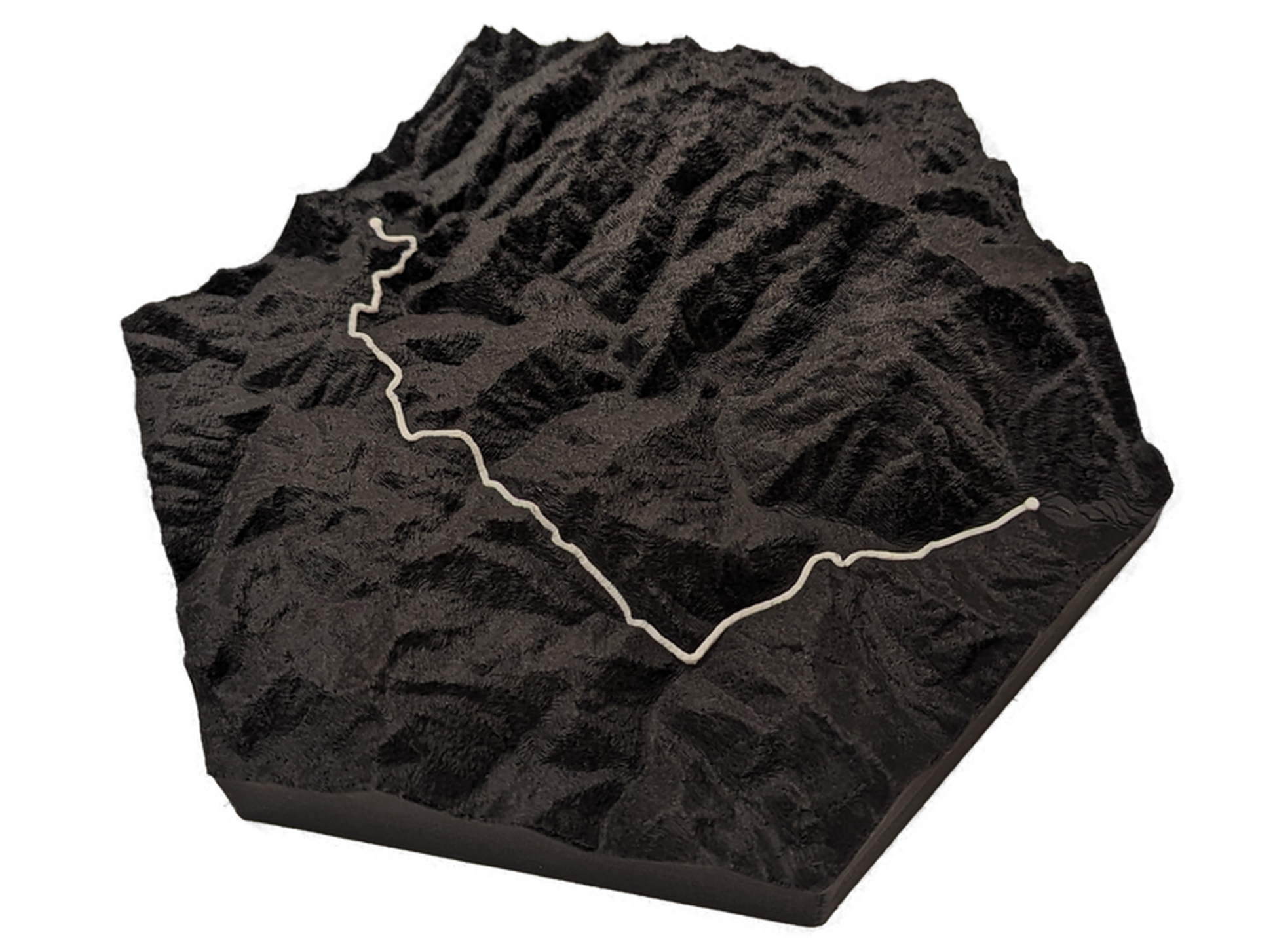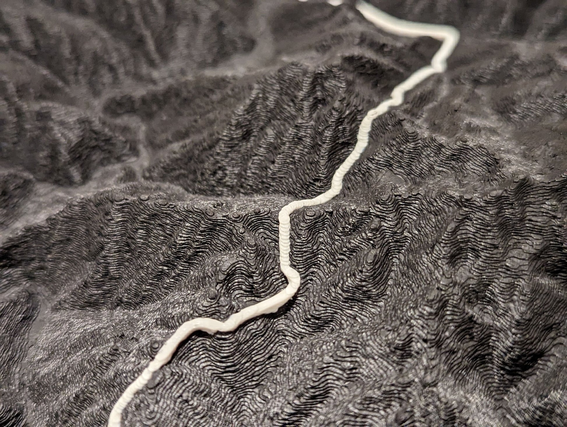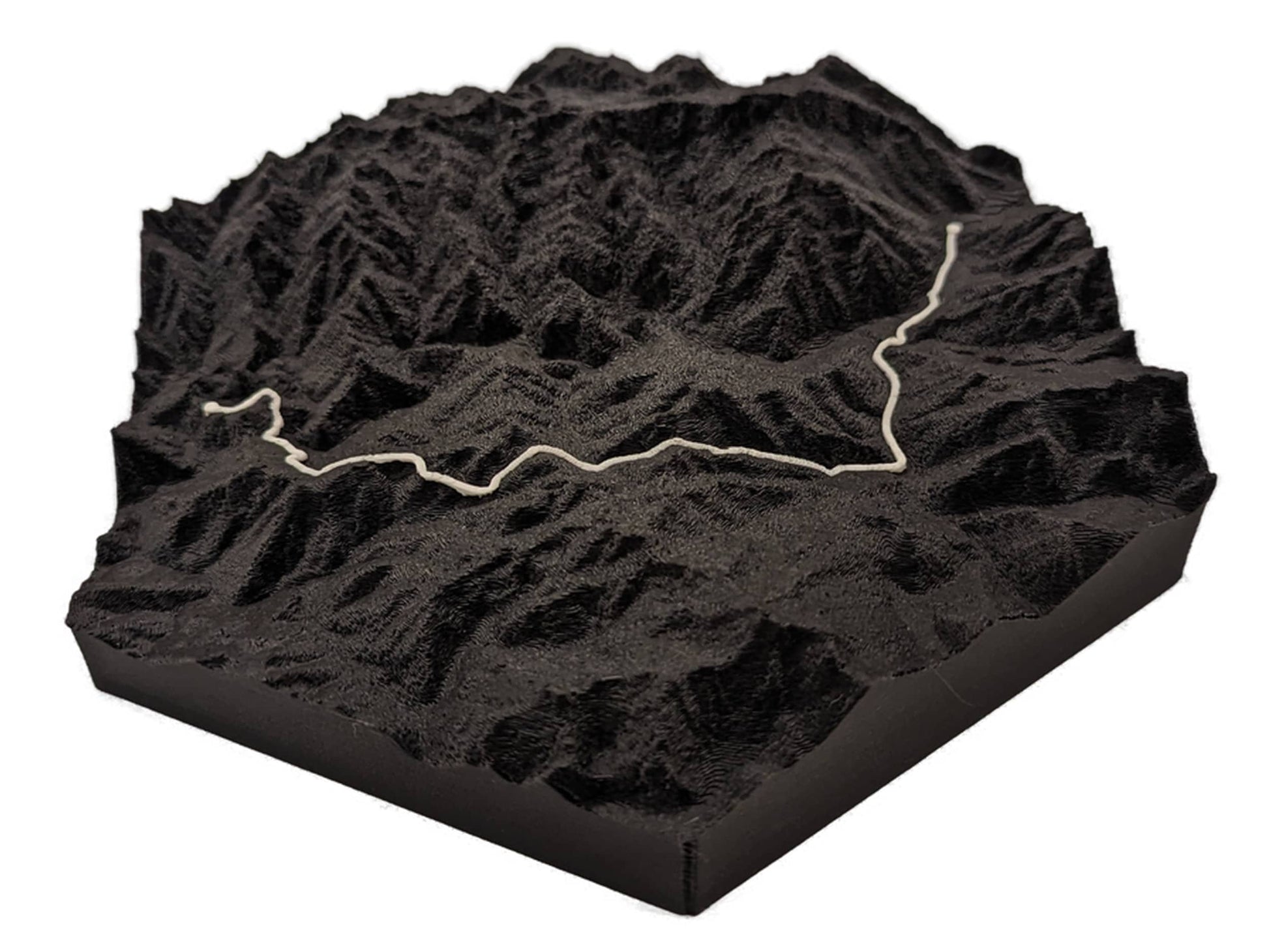 This map is made using multicolor 3D printing, where the terrain is printed in black and the trail is printed in white.