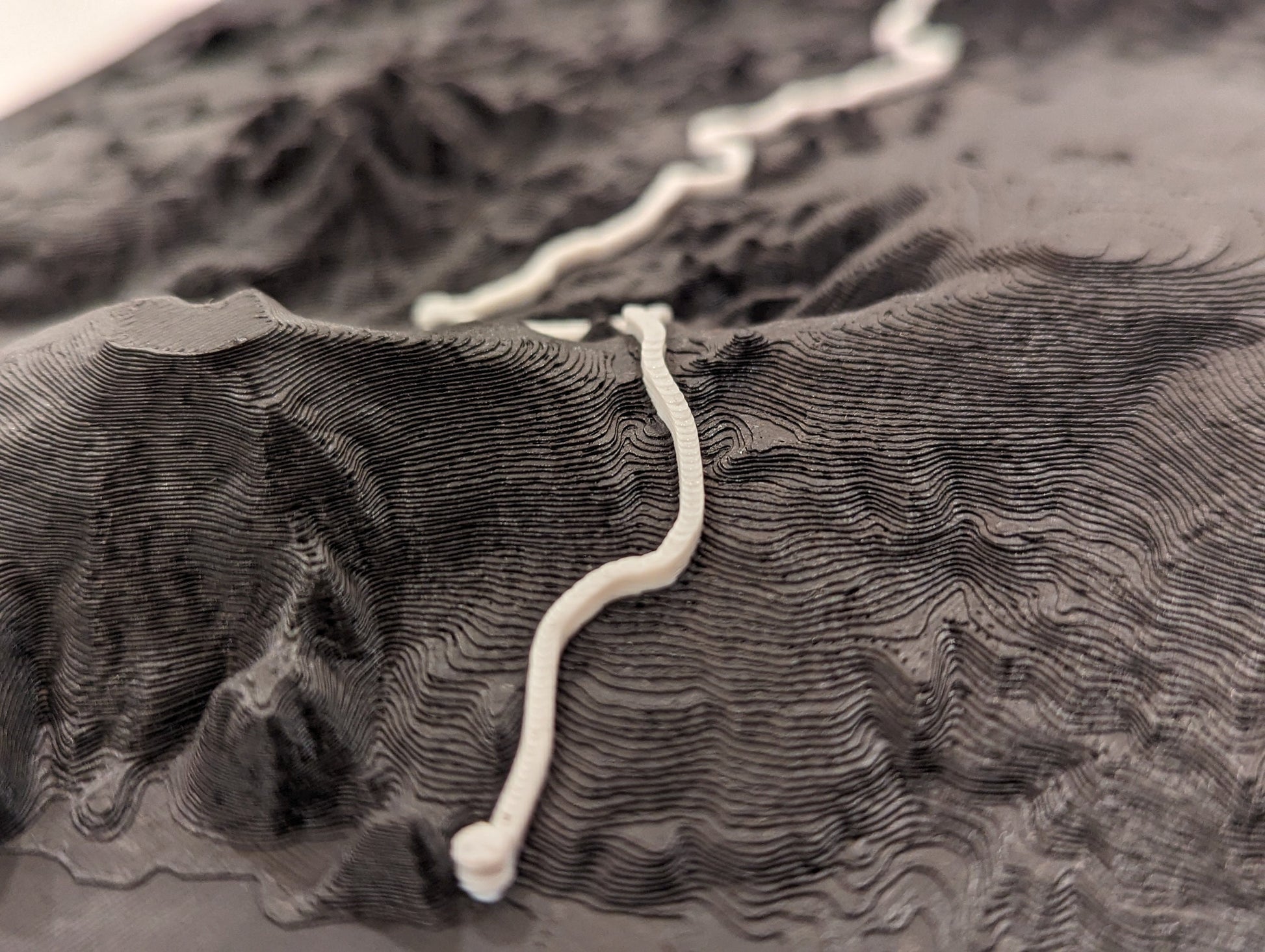 This map is made using multicolor 3D printing, where the terrain is printed in black and the trail is printed in white.