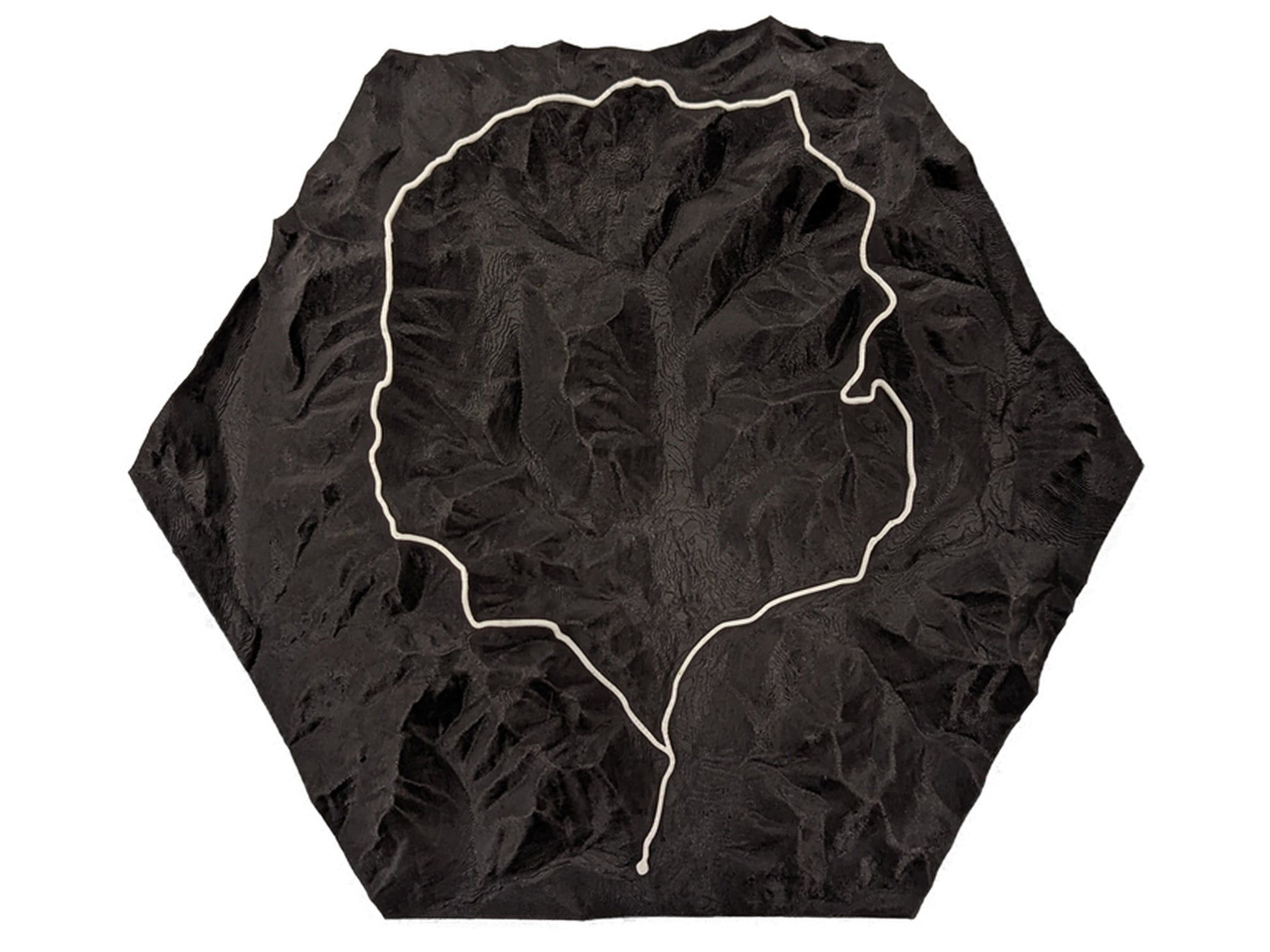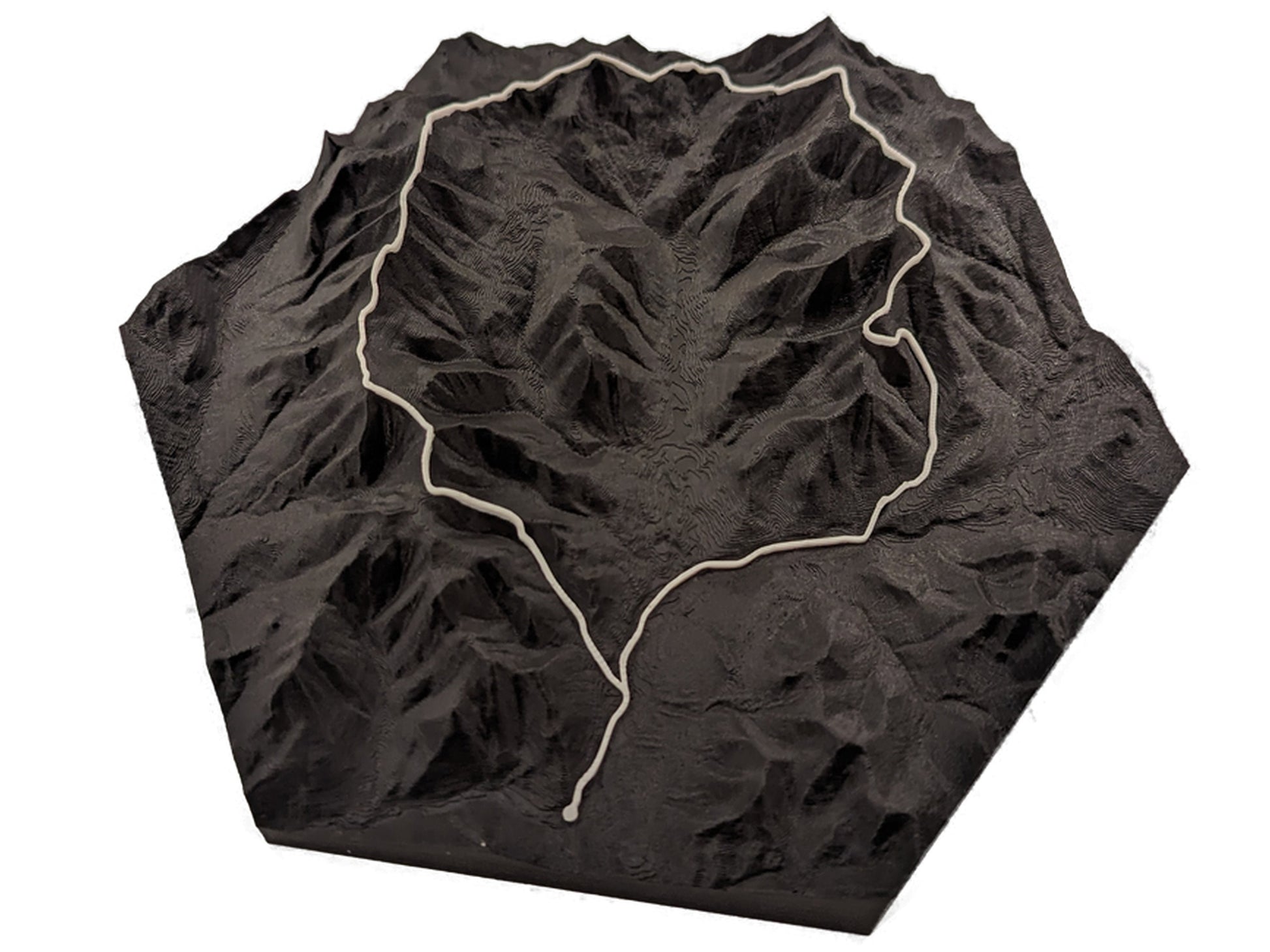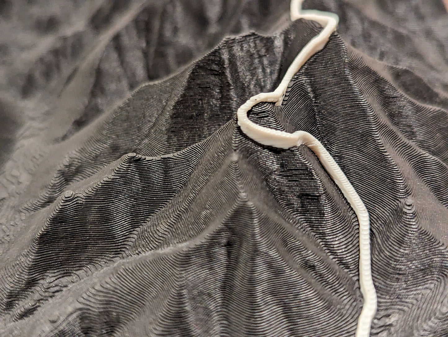 This map is made using multicolor 3D printing, where the terrain is printed in black and the trail is printed in white.